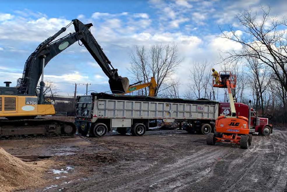 November 2019 - Site 108 - view looking south. Long stick excavator loading stabilized tar; manlift used to assist excavator operator in placing the load evenly in the bed of the trailer. Tank 3 is visible on the right side.