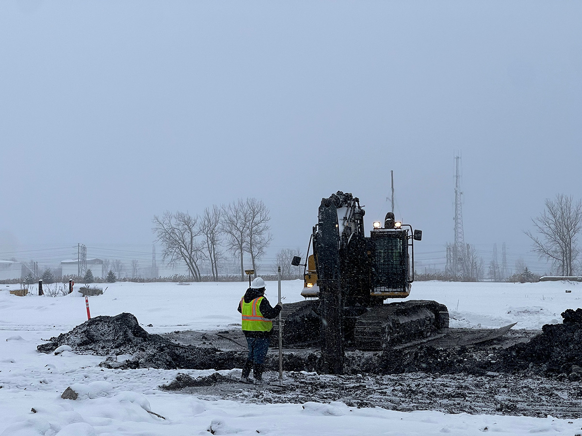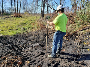 November 2020 - A survey contractor surveying the location and elevation of one end of a test pit